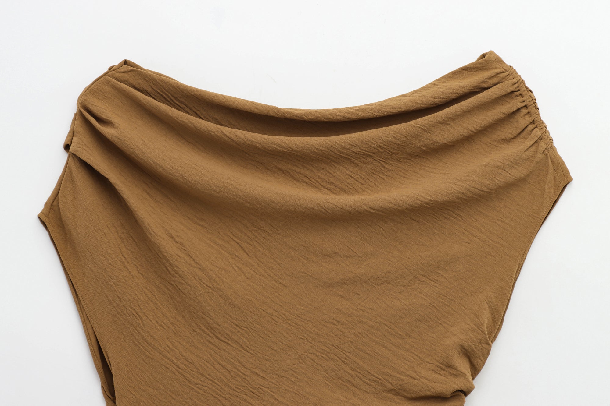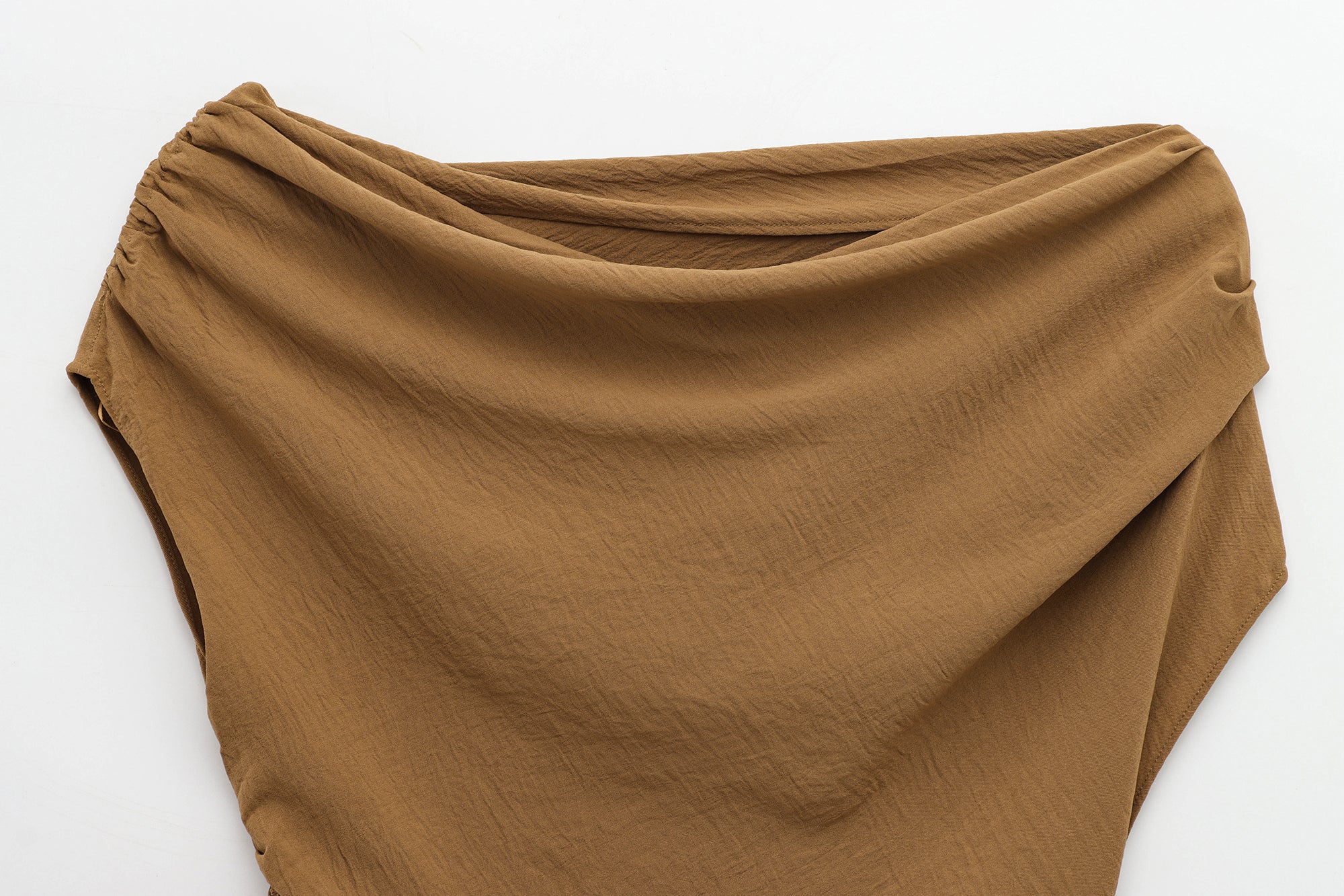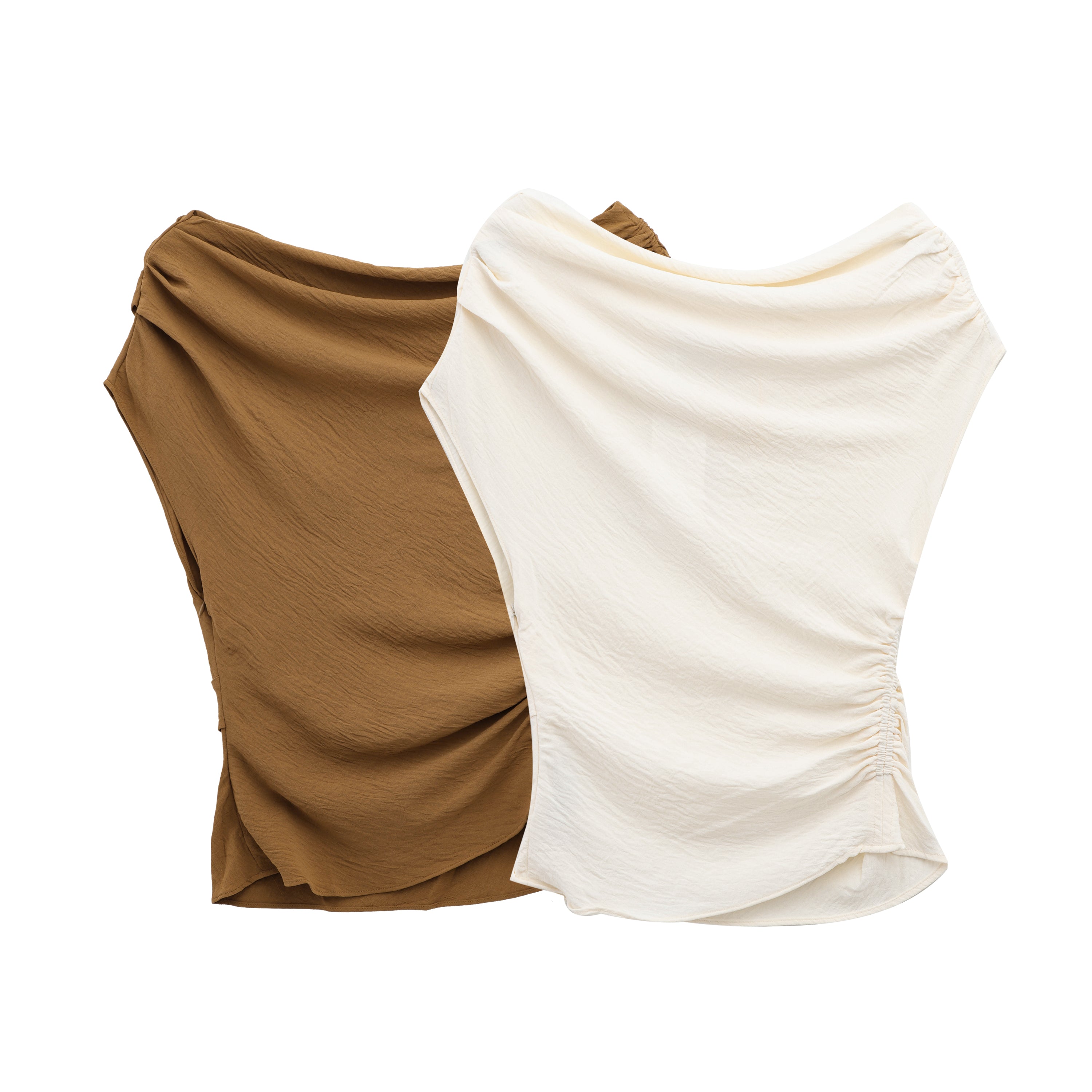 This asymmetrical pleated blouse offers a sophisticated silhouette with its unique design and solid color. Crafted to enhance your wardrobe,...