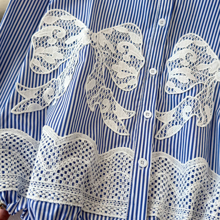 Introducing the Lace Bow Stripe Shirt for women. This stylish casual top features delicate lace detailing and a charming bow,...