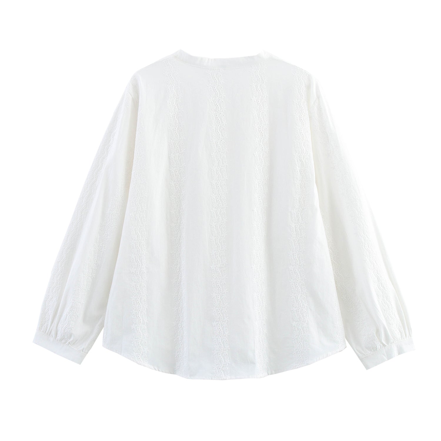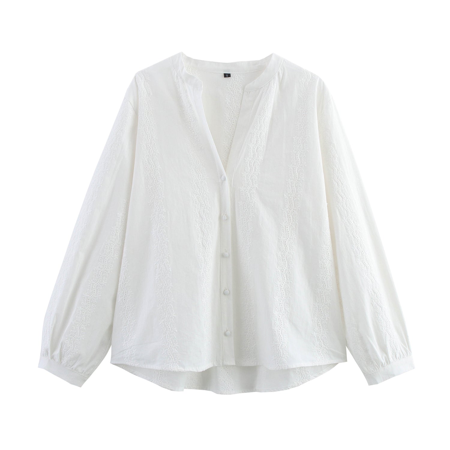 Embroidery Long Sleeve v Neck Buttons up Shirt