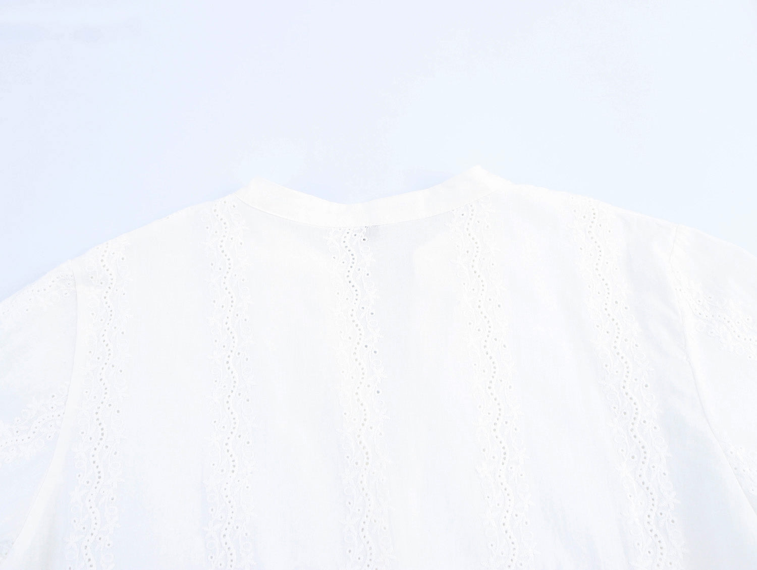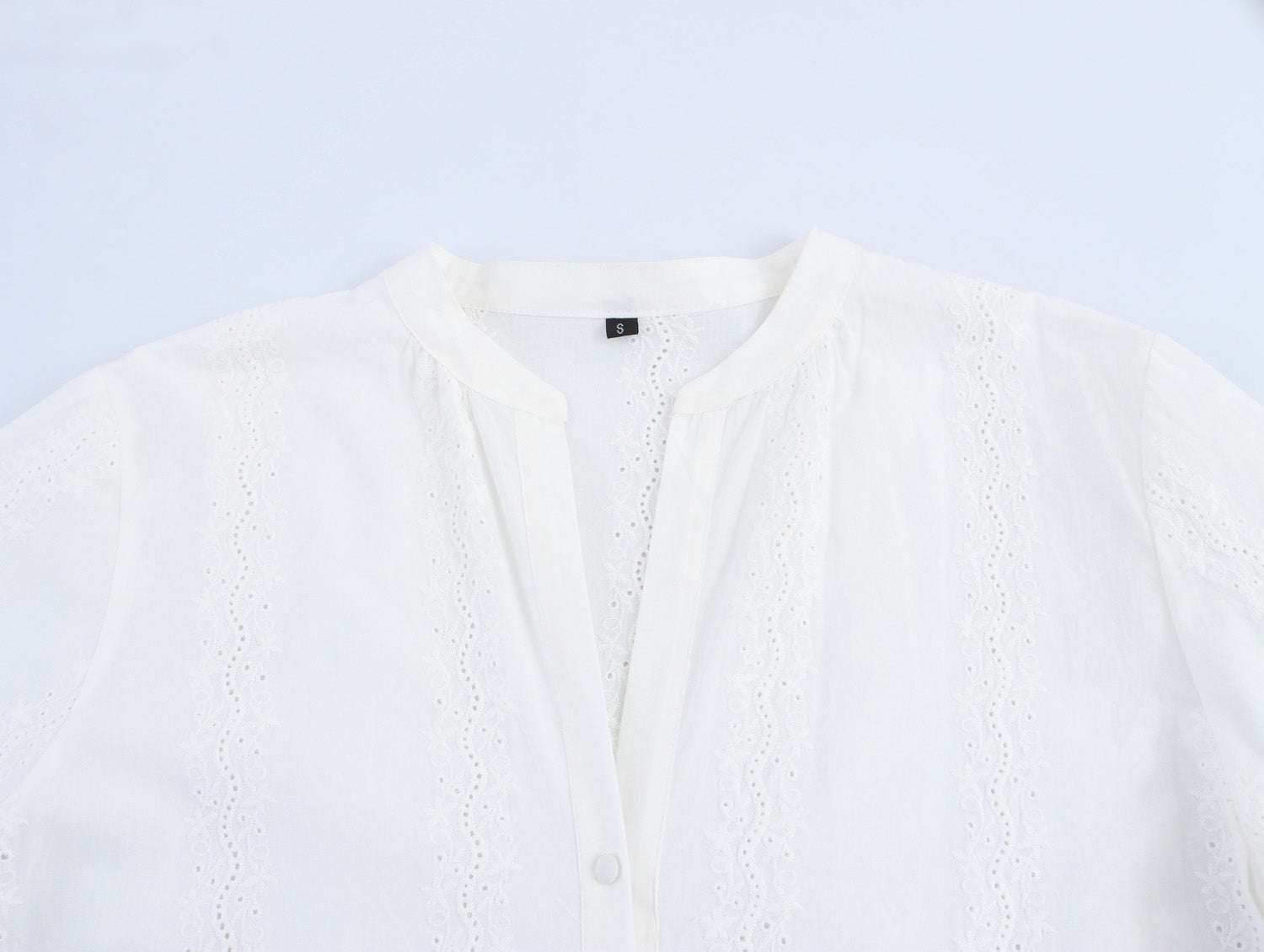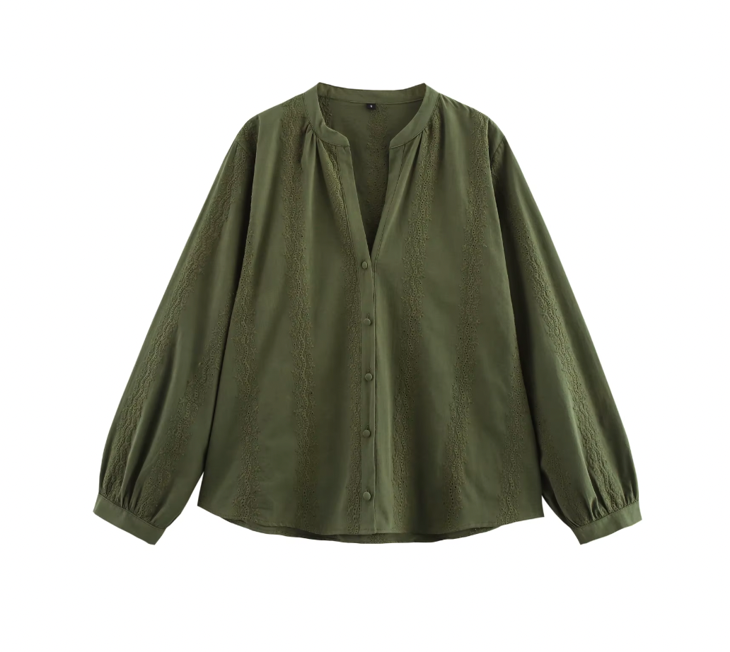 This expertly crafted long sleeve shirt features delicate embroidery and a flattering V-neck design. The button-up front adds a classic...
