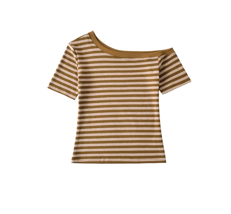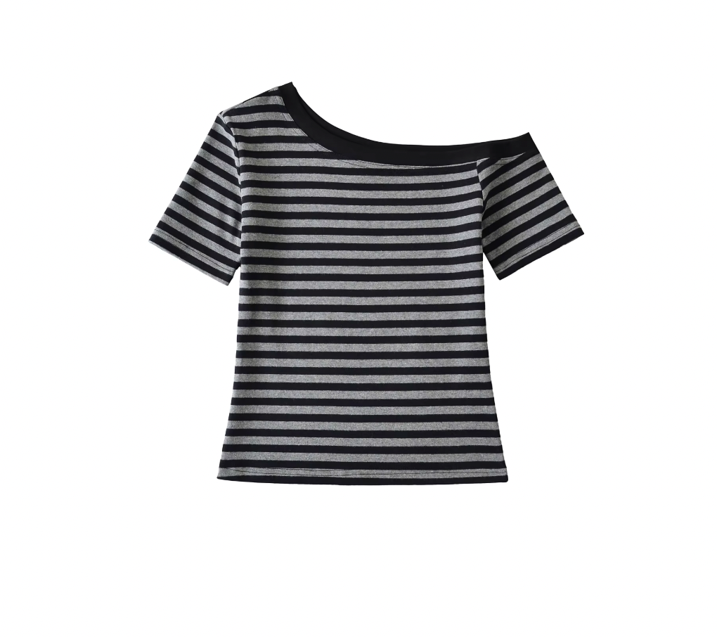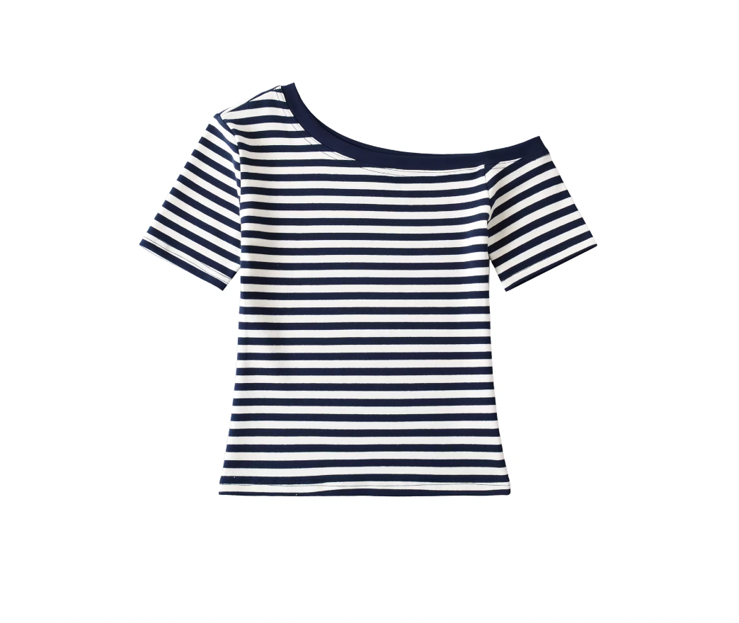 This short sleeve striped t-shirt features a distinctive asymmetrical design that adds a modern edge to a classic style. Crafted...