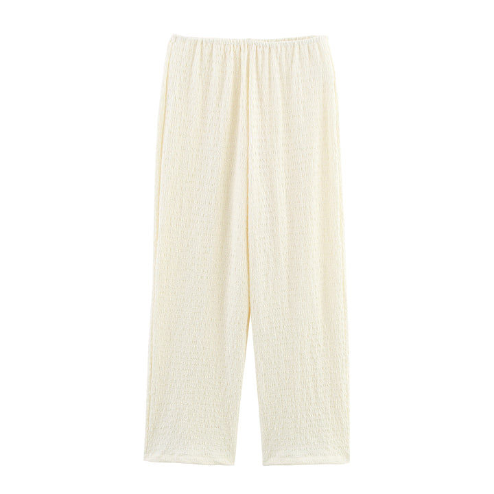 This elegant two-piece set features a sleeveless blouse paired with beige long pants, combining comfort and style effortlessly. The sleeveless design offers breathability and ease of movement, while the neutral beige pants provide a versatile foundation suitable for various occasions. Crafted for a polished look, this ensemble is ideal for those seeking a refined yet comfortable outfit option.