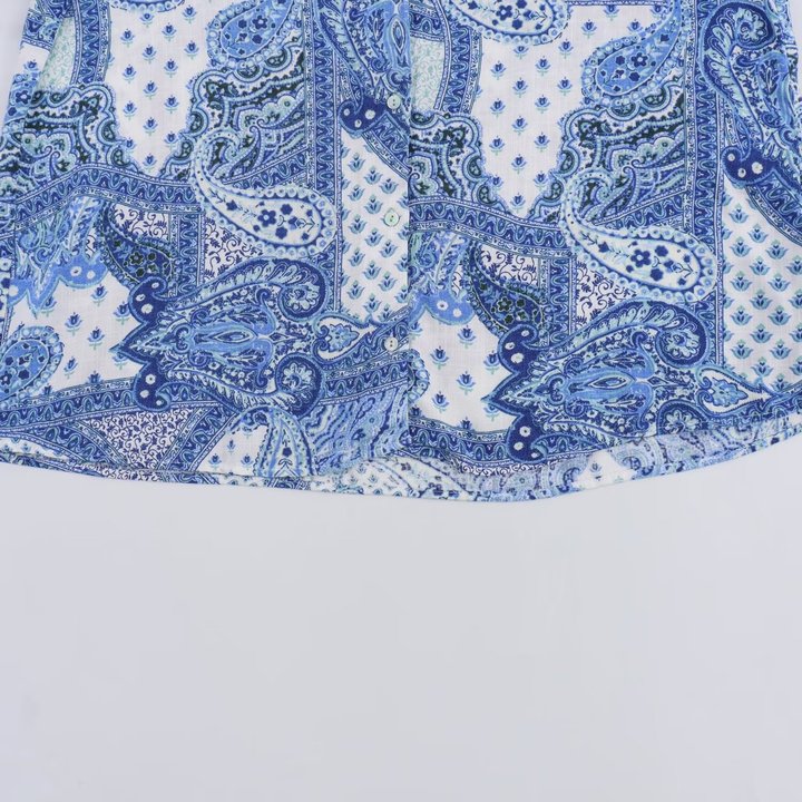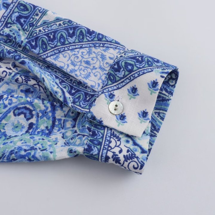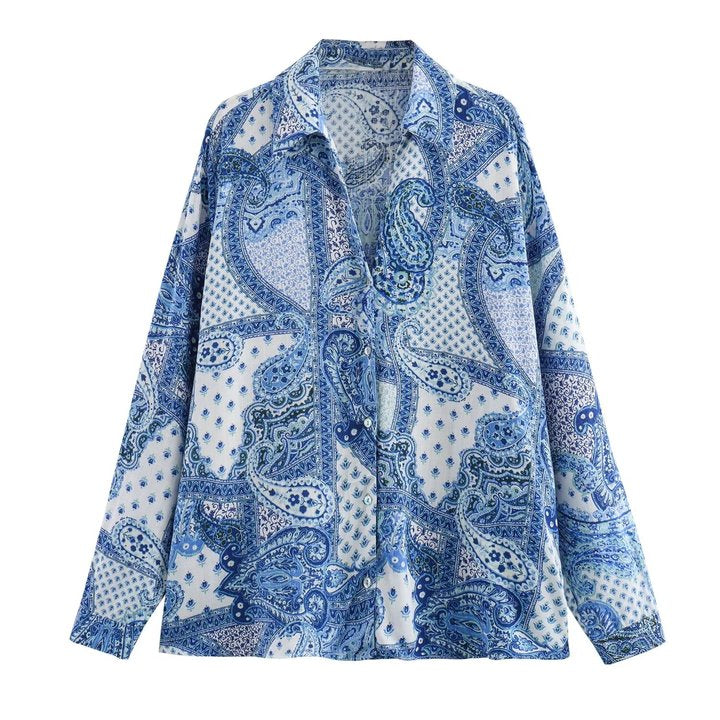 This blue blouse features a delicate floral print and a classic turn-down collar, combining elegance with casual style. Its long sleeves and button-up front offer versatility and comfort, making it ideal for everyday wear or smart-casual occasions. Crafted to provide a flattering fit, this top enhances your wardrobe with a refined yet relaxed look.
