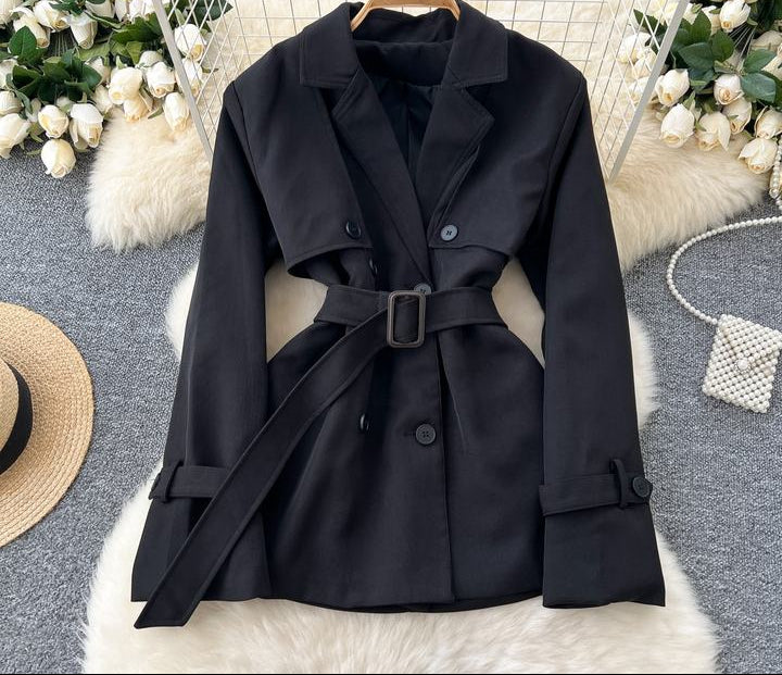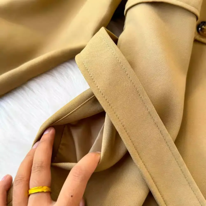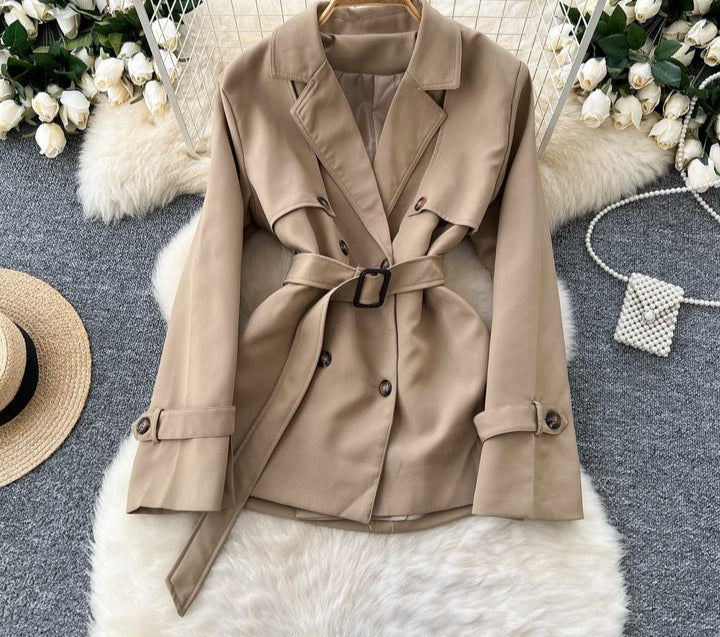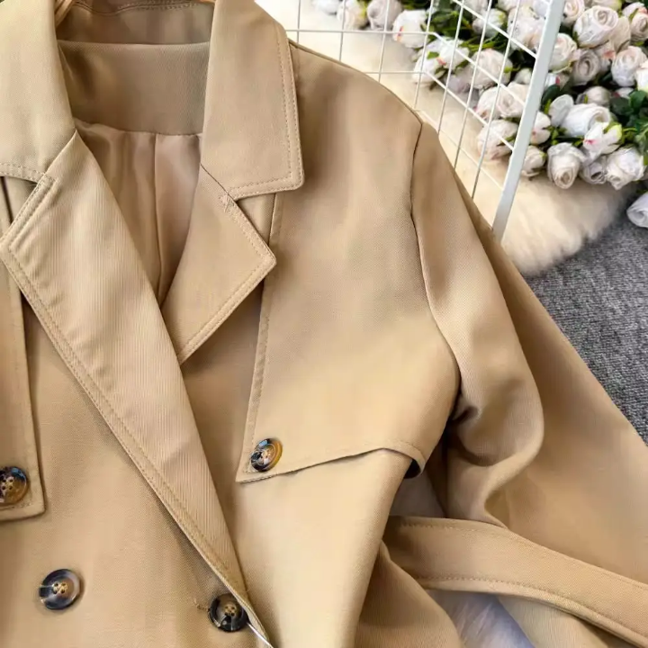 Expertly tailored double-breasted short trench coat designed for fall weather. Features classic styling with modern proportions, offering versatility for both...