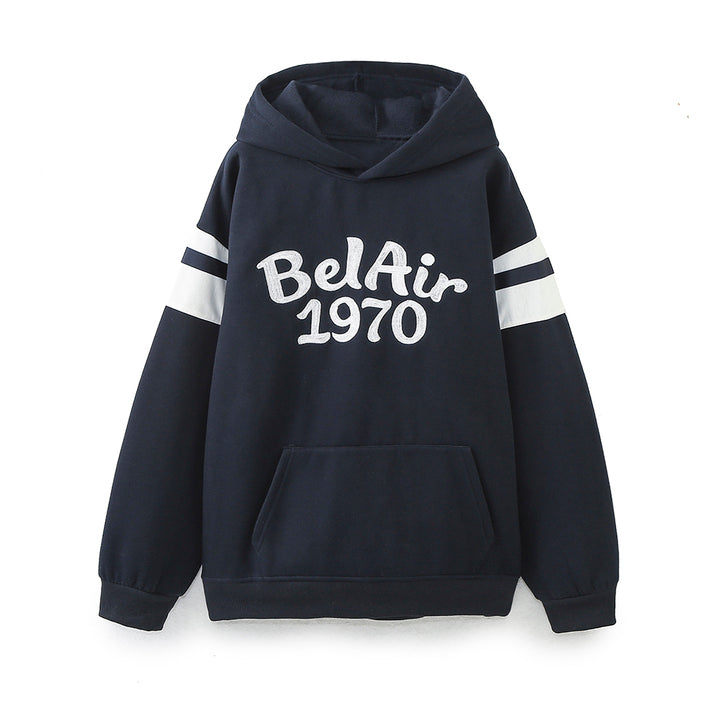 This navy long-sleeve sweatshirt hoodie for women features refined letter embroidery, combining casual comfort with subtle fashion detail. Crafted for...