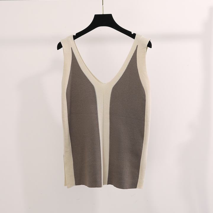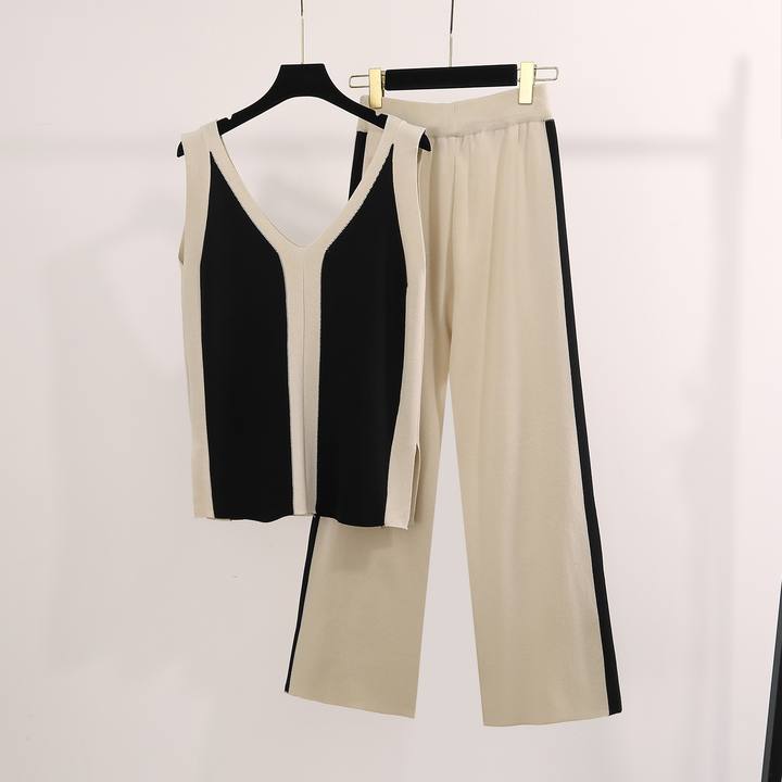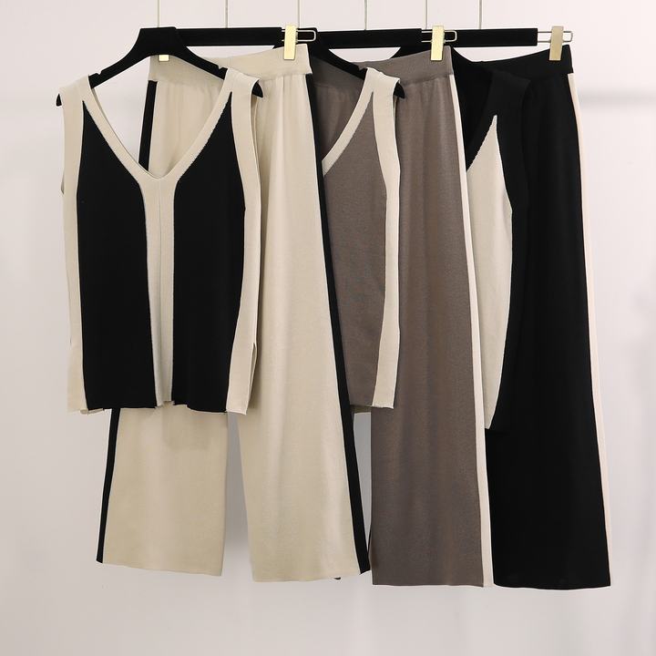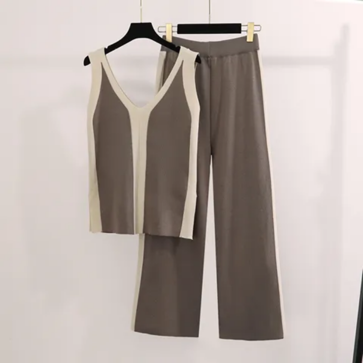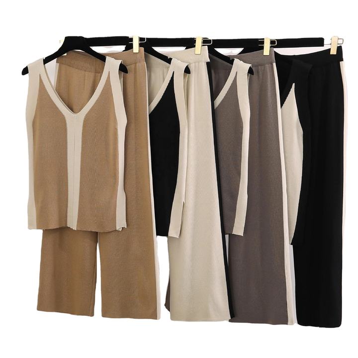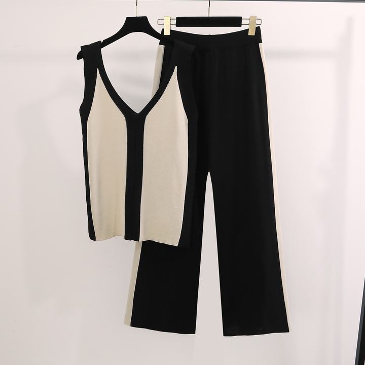 V-Neck Knitted Two-Piece with Wide-Leg Pants