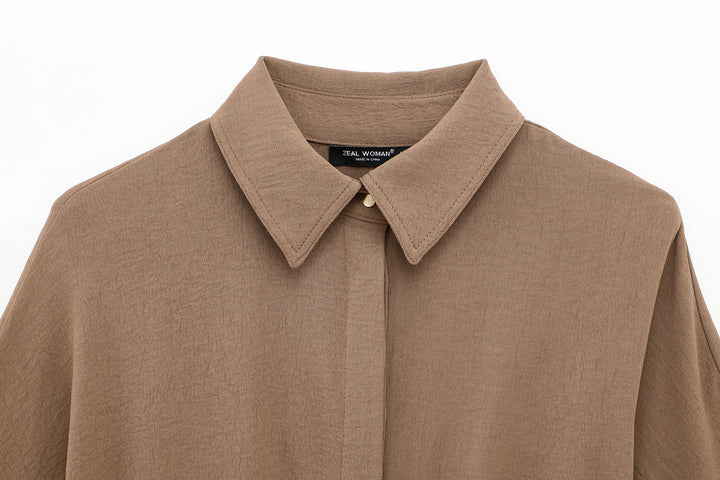 This khaki long-sleeve blouse features a classic button-up design, combining casual comfort with refined style. Crafted for versatility, it pairs...