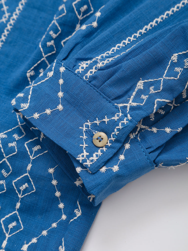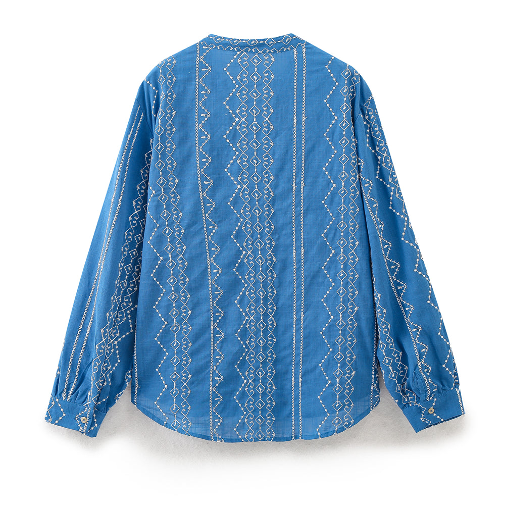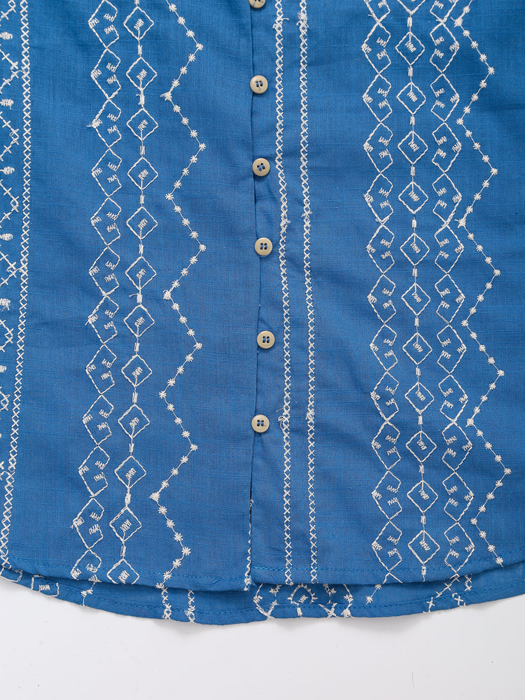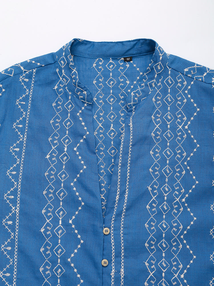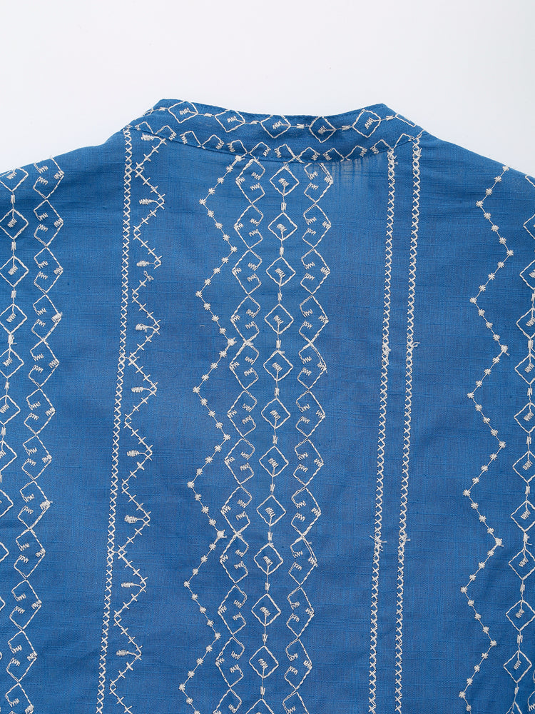 This expertly crafted V-neck shirt in a rich blue hue features intricate embroidery that adds a refined touch to your...